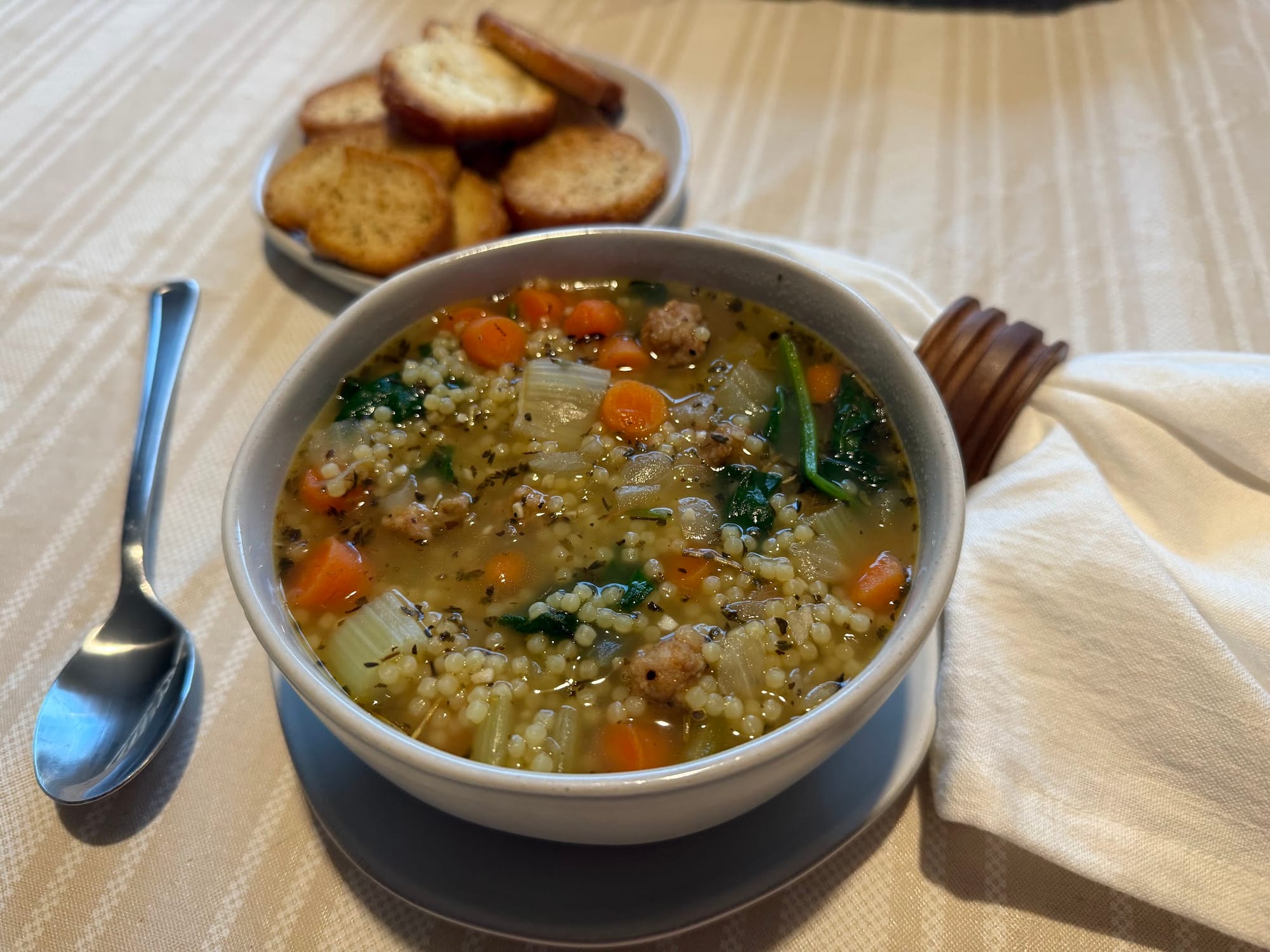 - Add in the sausage balls and the acini de pepe. Lower the heat to medium and cover with the lid. Simmer for 10-15 minutes.